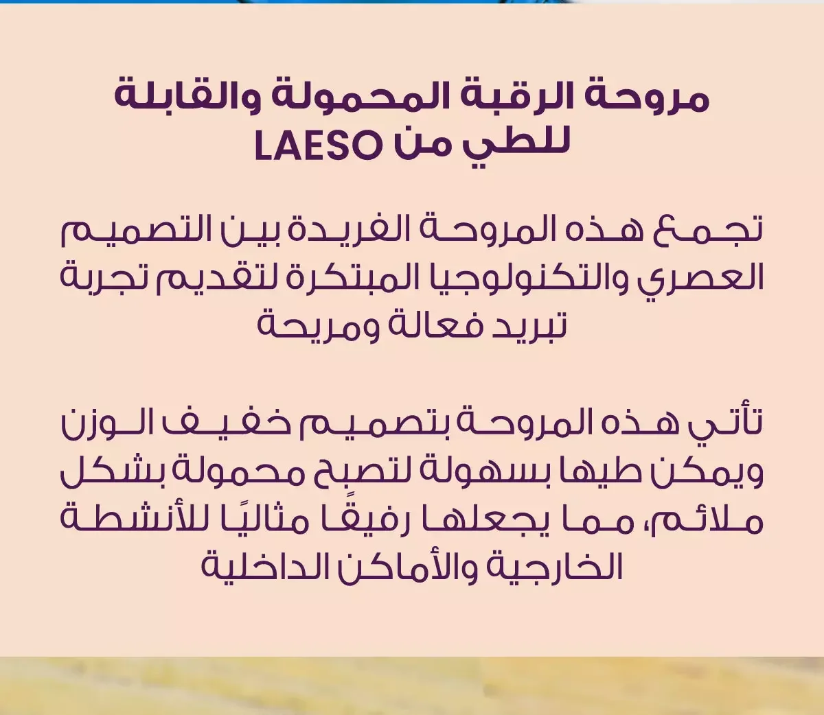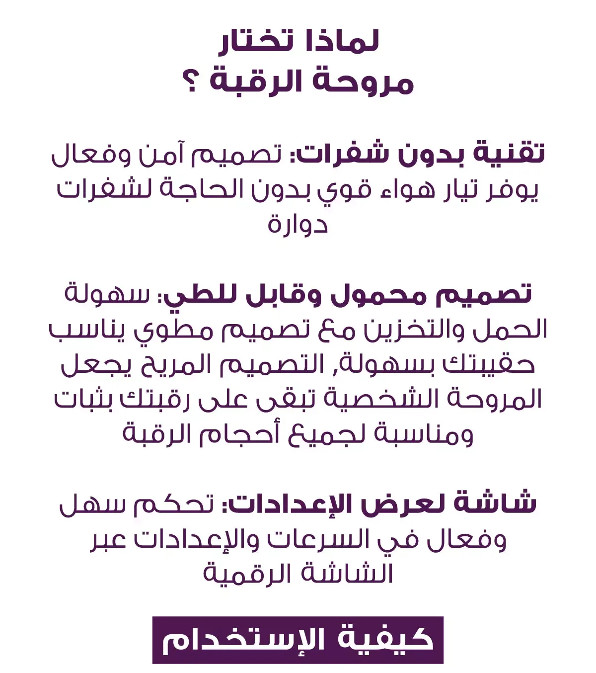 - الأذرع التي تحتوي على المراوح قابلة للطي، مما يسهل تخزينها ونقلها عند عدم الاستخدام.